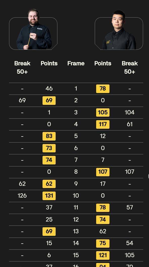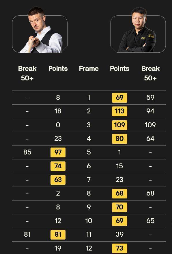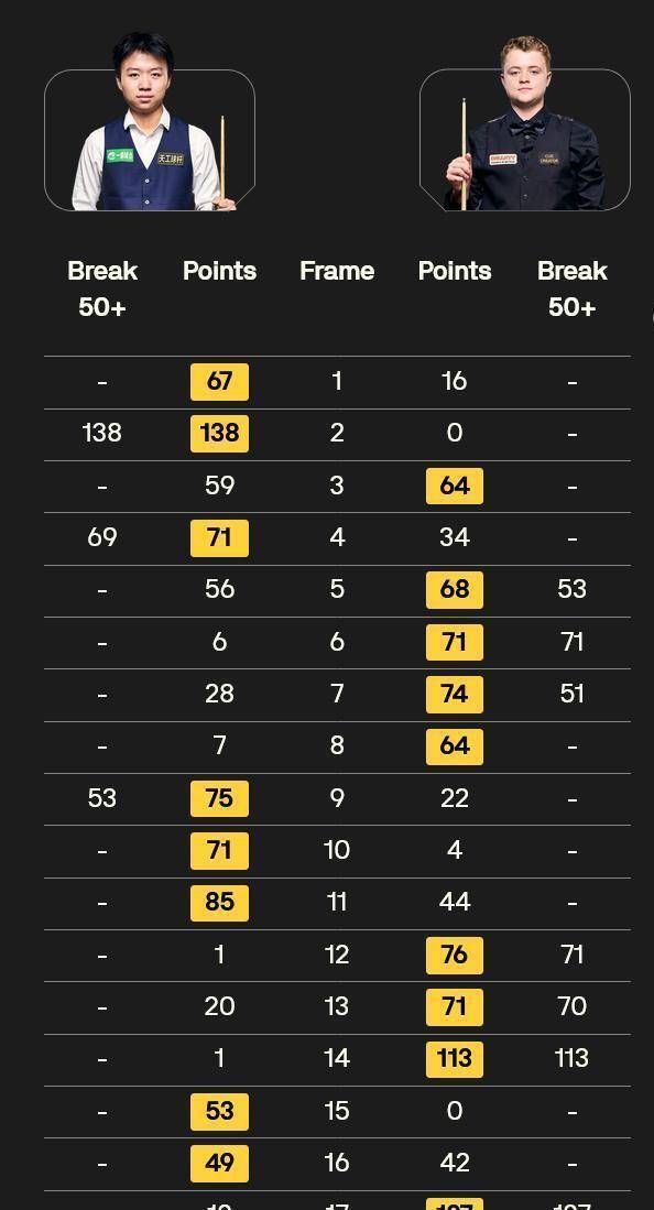 另一场中国德比战在庞俊旭和威尔士小将杰克逊·佩奇之间展开。 从过往交手记录看,佩奇略占上风,但那些都是短局比赛。 这场19局10胜的漫长对决,考验的是双方的耐力和稳定性。 第一阶段战罢,庞俊旭以4比5的比分稍稍落后。 比赛进入第二阶段,场上风云突变,庞俊旭的状态明显提升,他不仅成功反超了比分,更是一鼓作气率先拿到了赛点。 尽管佩奇努力追赶,但庞俊旭顶住了压力,以10比8的比分锁定胜局,惊险晋级。 这场比赛,庞俊旭的进攻火力全开,打出了三杆破百和五杆50+,这是他能够取胜的关键。