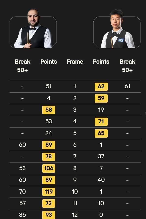 中国00后小将高阳的失利,则充满了戏剧性和遗憾。 他的对手是伊朗名将侯赛因·瓦菲,一位以犀利进攻著称的球员。 比赛的前半段完全在高阳的掌控之中,他一度取得了4比1的领先优势,形势一片大好。 然而,从第六局开始,场上局势发生了180度的大逆转。 瓦菲突然找到了手感,而高阳则仿佛失去了准星。 瓦菲一局接一局地赢球,竟然不可思议地连赢了九局。 最终,高阳从4比1领先,到4比10惨遭逆转出局。 全场比赛,高阳仅有一杆50+进账,而瓦菲虽然没有破百,却稳健地打出了六杆50+。 这场罕见的“九连鞭”逆转,让高阳的世锦赛之旅戛然而止。