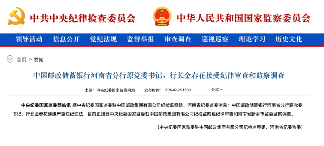 2月28日,中央纪委国家监委网站发布消息,据中央纪委国家监委驻中国邮政集团有限公司纪检监察组、河南省纪委监委消息:中国邮政储蓄银行河南省分行原党委书记、行长金春花涉嫌严重违纪违法,目前正接受中央纪委国家监委驻中国邮政集团有限公司纪检监察组纪律审查和河南省新乡市监委监察调查。