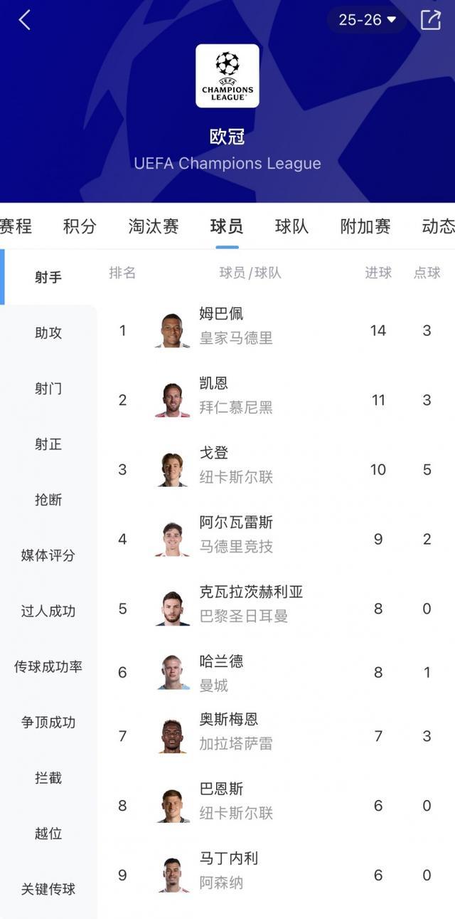 6-姆巴佩,14球,2025/26赛季(进行中),皇马