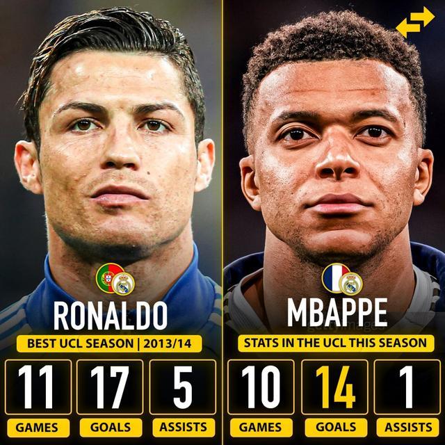 姆巴佩本赛季欧冠出战10场比赛已经打进14球,高居射手榜第一。而在欧冠单赛季总进球排行榜上,姆巴佩距离C罗在2013/14赛季的17球纪录还有3球之差,姆巴佩只要今晚打入一球就可以升至历史并列第三。